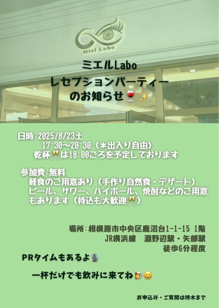 この度、ミエルラボでは、お披露目会と称しまして、8月23日(土)17:30~、レセプションパーティーを開催させていただきます。これを機に是非多くの方にミエルラボを知って頂ける機会にもなれば幸いです。また細やかですが、日ごろの感謝も込めて飲食も御座いさせていただきますので、ゆっくりしていって頂けるとなお嬉しいです。どなたでもご参加可能です。是非お気軽にご連絡くださいませ。
