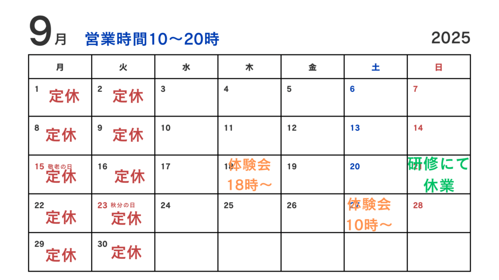 9月🎑特別定休日のお知らせ 2025 8/25 お知らせ 2025年8月25日 8月も暑い日が続きましたが、9月は少し過ごしやすくなることを期待しつつ、、、 9月の定休日のお知らせです♪ 体験会のご案内はまた別途させていただきます! 関連 お知らせ よかったらシェアしてね! URLをコピーしました! URLをコピーしました! コメント コメントする コメントをキャンセルコメント ※ 名前 ※ メール ※ サイト 次回のコメントで使用するためブラウザーに自分の名前、メールアドレス、サイトを保存する。 新しいコメントをメールで通知 新しい投稿をメールで受け取る