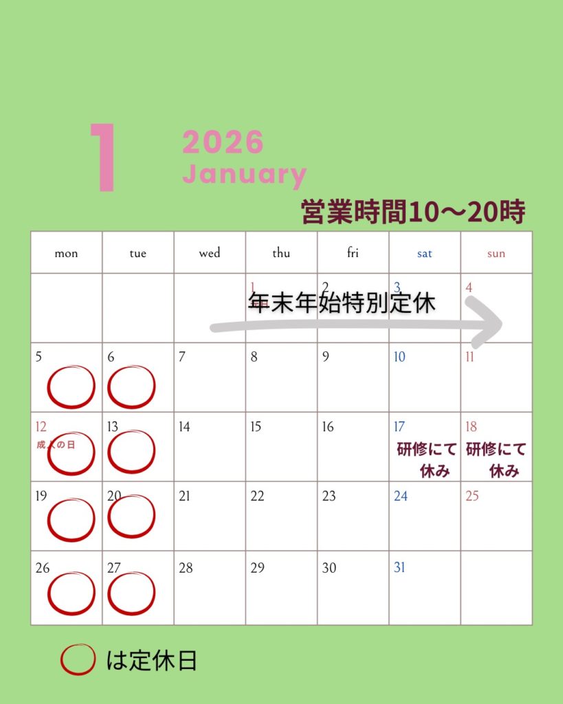 2026年1月特別定休日のお知らせ🎍 2025 12/25 お知らせ 2025年12月25日 年始は7日(水)からの営業となります。2026年もどうぞよろしくお願いします。 関連 お知らせ 1月 定休日 よかったらシェアしてね! URLをコピーしました! URLをコピーしました! コメント コメントする コメントをキャンセルコメント ※ 名前 ※ メール ※ サイト 次回のコメントで使用するためブラウザーに自分の名前、メールアドレス、サイトを保存する。 新しいコメントをメールで通知 新しい投稿をメールで受け取る