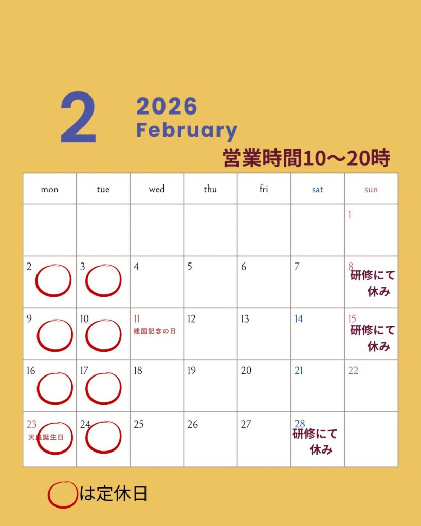 2月の特別定休日のお知らせ★ 2026 1/27 お知らせ 2026年1月27日 2026年もあっという間に2月ですね♪2月のお休みはカレンダーよりご覧ください★ 2月もどうぞよろしくお願い致します。 関連 お知らせ よかったらシェアしてね! URLをコピーしました! URLをコピーしました! コメント コメントする コメントをキャンセルコメント ※ 名前 ※ メール ※ サイト 次回のコメントで使用するためブラウザーに自分の名前、メールアドレス、サイトを保存する。 新しいコメントをメールで通知 新しい投稿をメールで受け取る